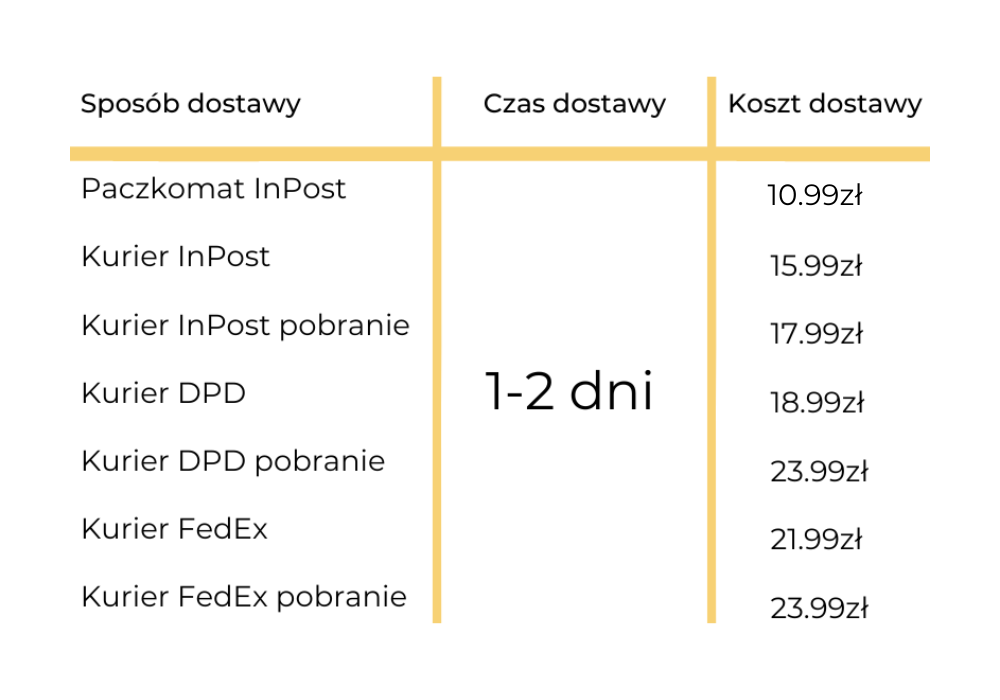 Towar zamówiony do godziny 13:00 wysyłamy tego samego dnia.