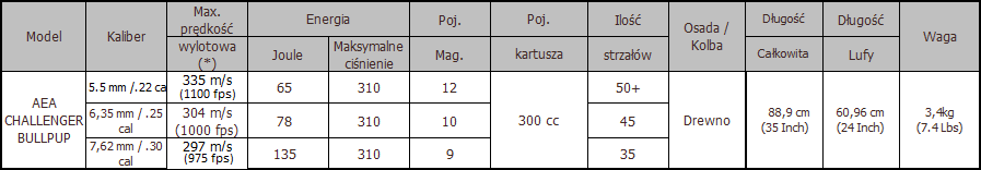* Powyżej podane wartości maksymalne dotyczą wiatrówek FAC (bez limitu energii).